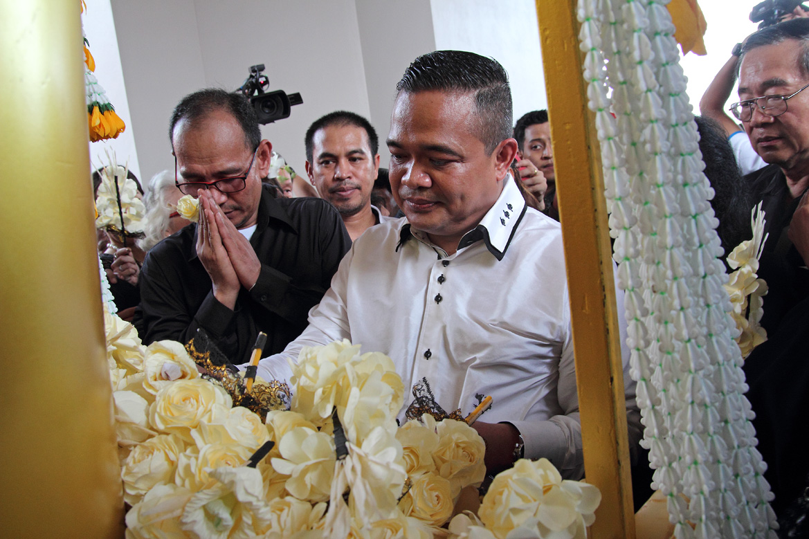 Yonguth Tiyapairat pours sacred water and scented oil over Dr Apiwan’s corpse