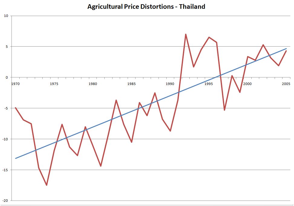 The data are taken from page 60 of this fascinating report on Distortions to Agricultural Incentives in China and Southeast Asia by Kym Anderson and Will Martin. (I hope I have interpreted their data correctly – please let me know if you think I haven’t.) Here is a key quote from their report:
