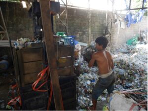 A male labourer working for a pengepul in Sumbawa feeds plastic into a press machine (Photo- author)