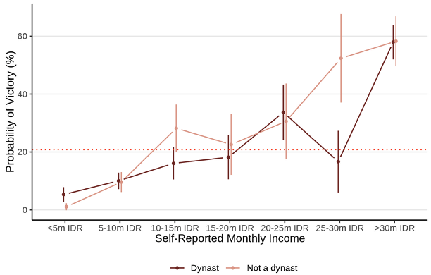 In Figure 4, we conduct an analogous analysis looking at a candidate’s status as a member of a political dynasty (or not). With Gibran Rakabuming Raka’s recent election as vice president on Prabowo Subianto’s ticket, analysts of Indonesian politics are rightly attuned to the influence of nepotism in structuring electoral politics. But Figure 4 reveals that one’s status as a dynast is in fact inconsequential when viewed in light of the electoral advantage of wealth. Indeed, it may be the case that dynasts and incumbents perform better simply because they are wealthier than their competitors—not because of any inherent advantage conferred by the political networks coming with those positions. Figure 5 shows, consistent with this, that wealthy dynasts have equivalent electoral prospects to wealthy non-dynasts—and that this relationship holds across the income distribution.