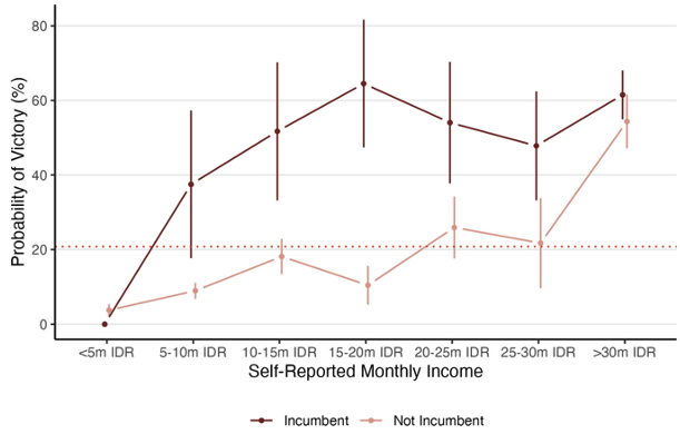 One exception to our findings concerns the role of incumbency. Figure 5 shows that, once in office, poorer candidates do approximately as well as their richer peers—although a slight electoral disadvantage continues to exist. To cite concrete numbers, 40% of incumbents who earn Rp10 million a month won their contests, compared to 60% of incumbents who earn more than Rp30 million a month.