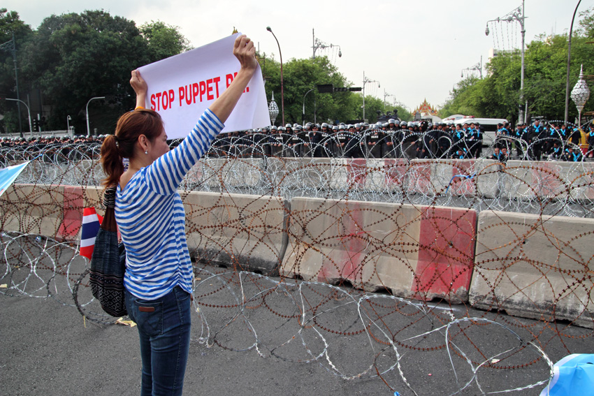 I walked then to the soft spot of the area – the barricade blocking the protest site from Government House at Misakawan intersection. The second soft spot was the opposite barricade at Makhawan, where a protest convoy was to join the main protest site. I decided though to stay at Misakawan because of the close proximity to the main rally site, while Makhawan would have been a huge detour as police did not allow journalists to walk past Government House. The protesters aim was to extend the rally site from Royal Plaza through Rajadamnern Avenue passing Government House, which the police were to strictly keep off limits to protesters, fearing another seizure of Government House. Police had already erected the night before a barricade with concrete slabs and several rows of barbed wire. Protesters of course claimed that the rally site was too small, which quite possibly might have been the case if the expected 70,000 protesters had arrived. While police counted maybe 50,000 protesters, privately I was told by high ranked officers that they thought that 30,000 protesters at most would come. Nobody though really expected such a low turnout, especially that so few hardcore guards were joining the protest, as intelligence was quite clear that more than 1000 guards were ready to join in Bangkok and in the provinces.