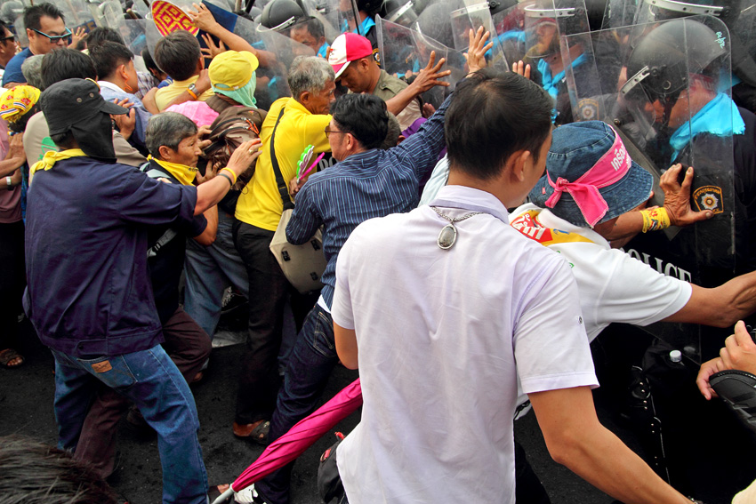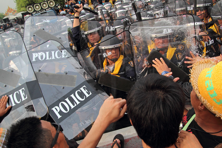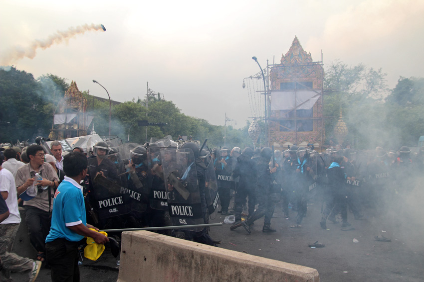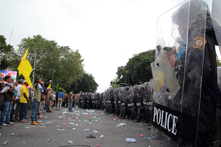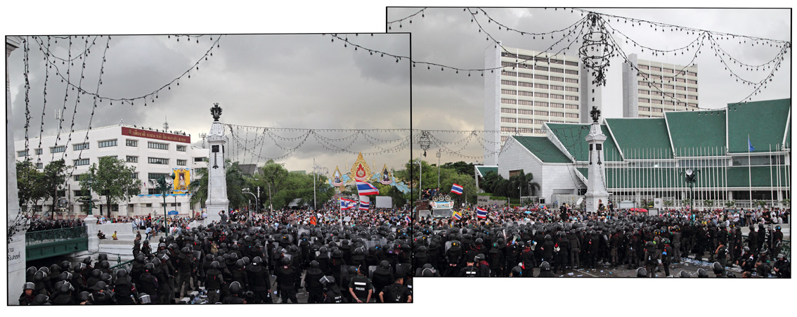Protesters again moved up to face the police lines, but kept a few meters distance, and the situation remained calm. A few overexcited protesters were quickly led away by guards. A loudspeaker duel between a mobile stage of the protesters and the police began which lasted the whole day (I tried to avoid listening as it was quite shrill at times – protesters accused police of being cruel, lackeys of Thaksin, and that they were fighting for the monarchy, while police said that they were following orders and doing their duty).