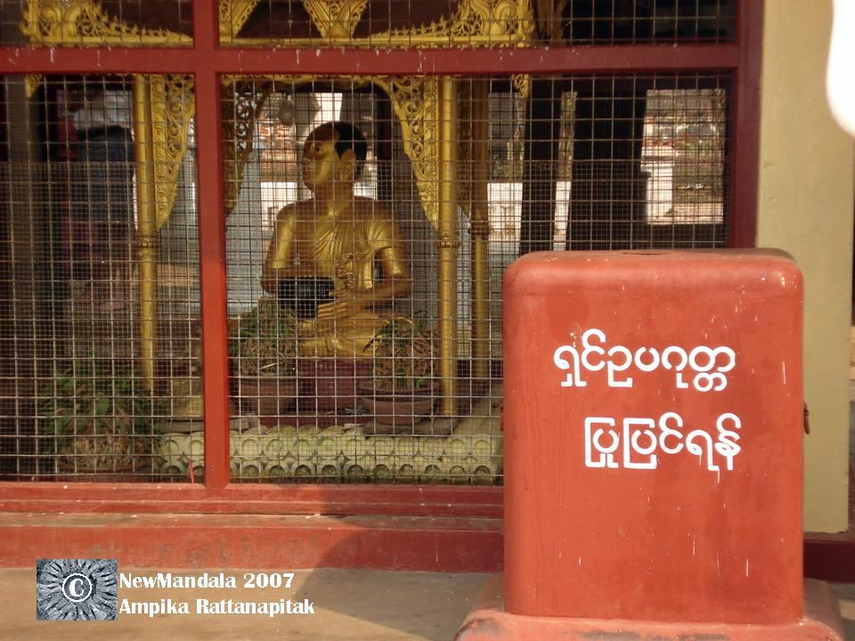 Upakhut is an important figure in local belief in many areas of Burma, northern Thailand and Laos. The stories of his origins are numerous. (For those interested, The Legend and Cult of Upagupta by John Strong has a wealth of detail.) In Sanskrit legend he is the son of a perfume maker and one of the early followers of the Buddha. In northern Thailand, many villagers believe that Upakhut is the son of the Buddha himself. Legend has it that he was conceived when a fish ate some of the Buddha’s semen when he washed his robe (or bathed) in a river. Upakhut was born and lives in a grand palace at the bottom of the ocean. One of his key roles is to provide protection on the occasion of major Buddhist festivals (poi luang) when he is taken from the river and installed in a temporary pavilion in the temple grounds. Here is a brief description of one such occasion from the northern Thai village of Baan Tiam.