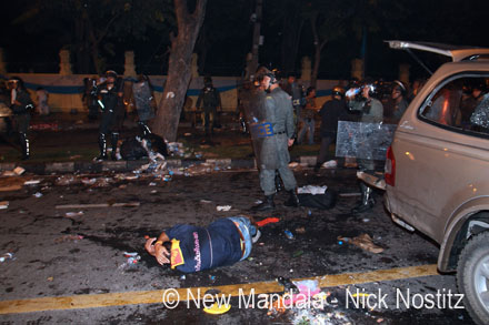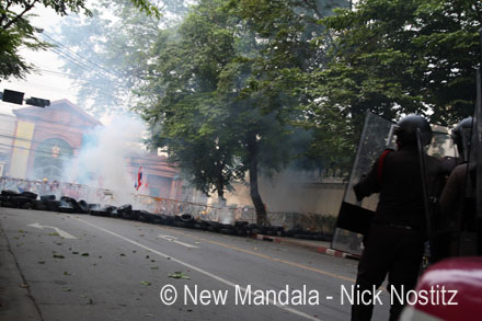 In the afternoon, I got a call that hostilities had broken out again, when police had to reopen the door to Parliament at Rathchawithi Rd. I came from Ruamchit Rd., and straight away I was caught up with PAD under a barrage of police fired teargas grenades, trying to repel a PAD attack. One of those grenades landed maybe a meter or so away from me while I ran, and exploded with a tremendous noise.