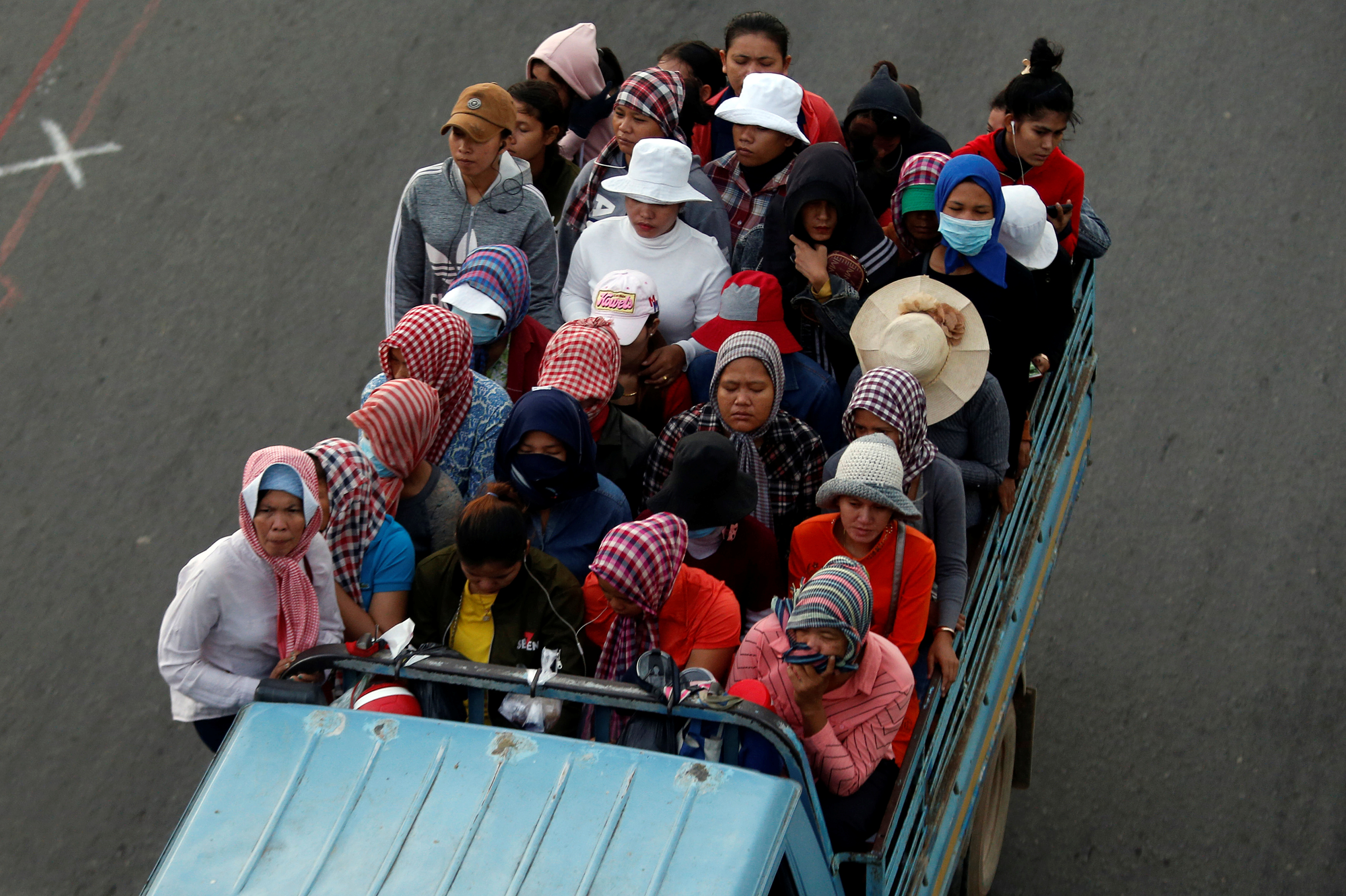 Garment workers stand on the back of a truck as they travel to work, on the outskirts of Phnom Penh