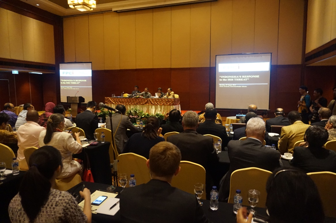 At a seminar held on 25 August at Jakarta’s Borobudur Hotel, Deputy Minister for Foreign Affairs Dino Patti Djalal and head of Anti-Terrorism Body BNPT Anshyaad Mbai explain to foreign diplomats how Indonesia views the “ISIS threat”. Photo: Dominic Berger