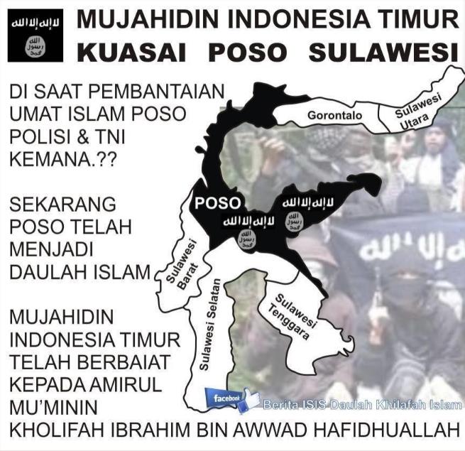 ISIS separatists? An image shared on twitter depicts large parts of Sulawesi taken over by the pro-ISIS group Mujahidin Indonesia Timur(MIT). Images such as this are sure to feed into the governments perception that ISIS a threat to the NKRI.