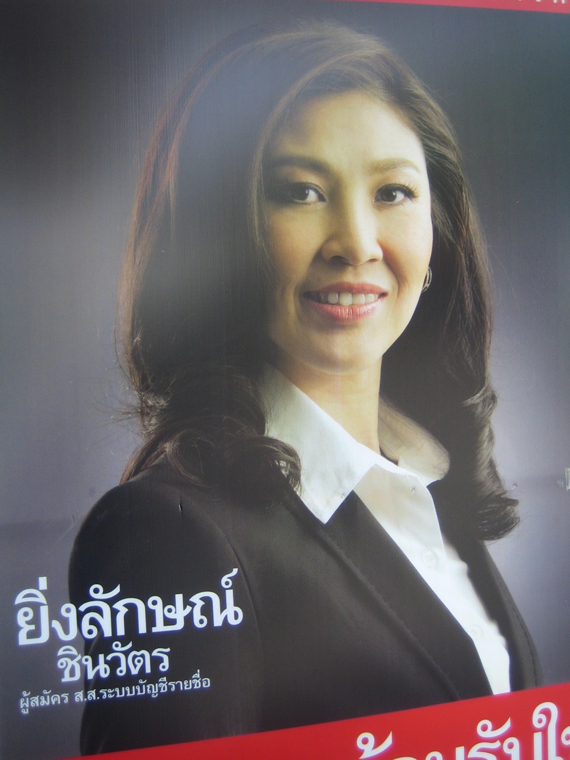 Over last weekend, Bangkok was smothered with posters of Yingluck Shinawatra. Probably most of Thailand too. The poster is the first shot in Pheu Thai’s election campaign, and what a shot.